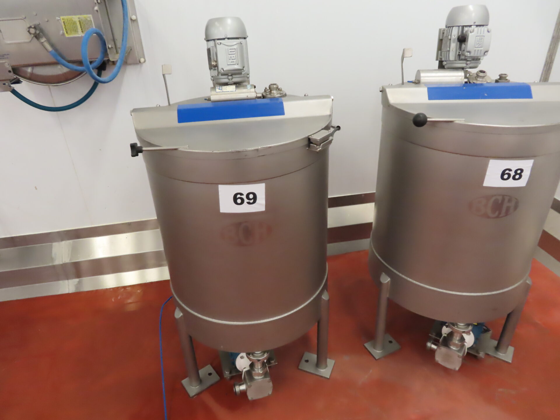 2x BCH single skin vessels/tanks. All S/S. With mixing to keep the product moving and mounted underneath is s pump to pump the liquid out.