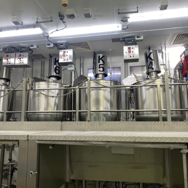 600 litre Steam jacketed cooking vessel. With scrap surface mixing and also a high shear mixer. Was previously doing soups with large particules like cud’s of carrot and stripped chicken. It is also capable of working with smooth sauces as well.