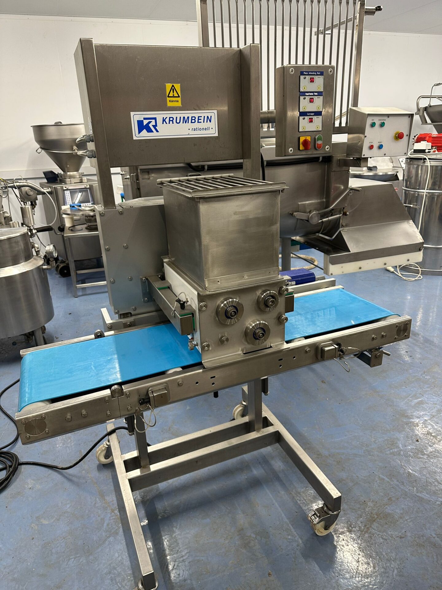 Krumbein twin lane buttering machine. Variable speed conveyor belt and variable speed application roll speed. Mobile on wheels. Fully working