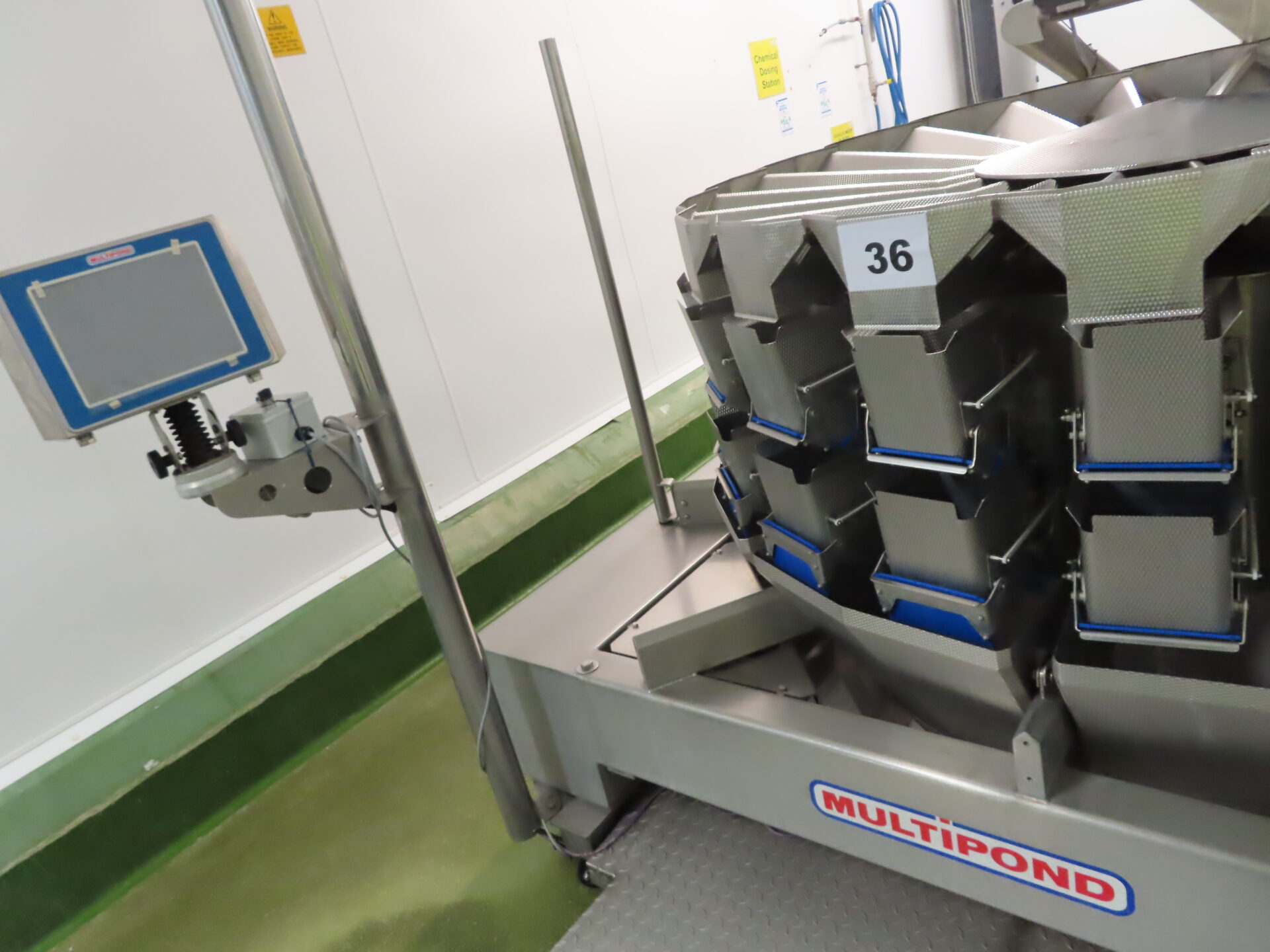 Multipond 20 head multi head weigher type MP20/22-FFC. Max weight 3000 g. Min 50 g. Touch screen controls stores various different product and easily selected within the interface. All S/S dimpled buckets.